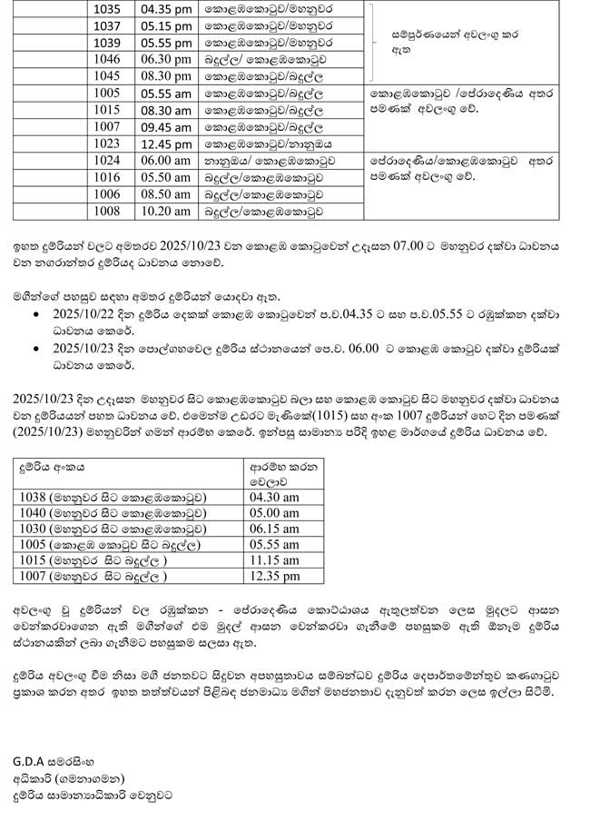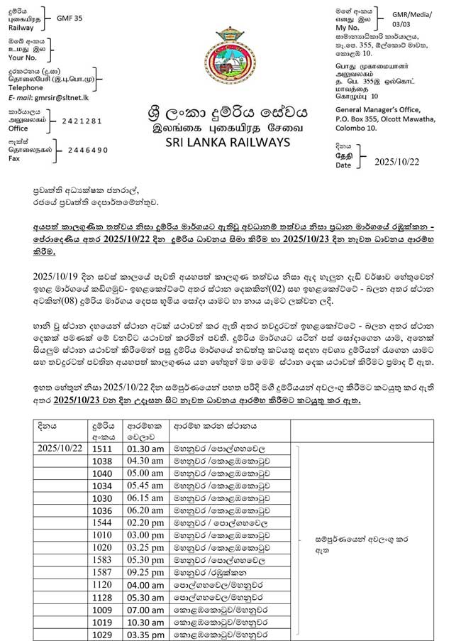 ඒ අනුව අද (23) උදෑසන සිට මහනුවර – පොල්ගහවෙල සහ මහනුවර – කොළඹ කොටුව මාර්ගවල දුම්රිය ධාවනය නැවත ආරම්භ කර ඇති බව දුම්රිය දෙපාර්තමේන්තුව නිවේදනය කරයි.