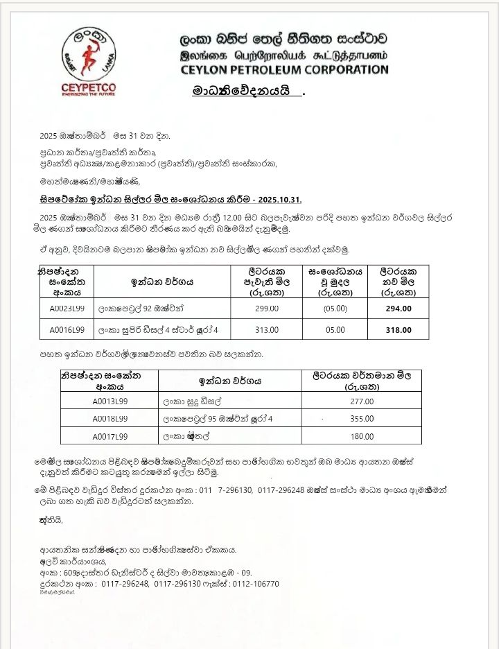 මාසික ඉන්ධන මිල සංශෝධනය අනුව නවතම ඉන්ධන මිල ගණන් සම්බන්ධයෙන්