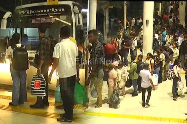 බස්වලට ගොඩවීමට දිගු පෝලිම් දැකිය හැක