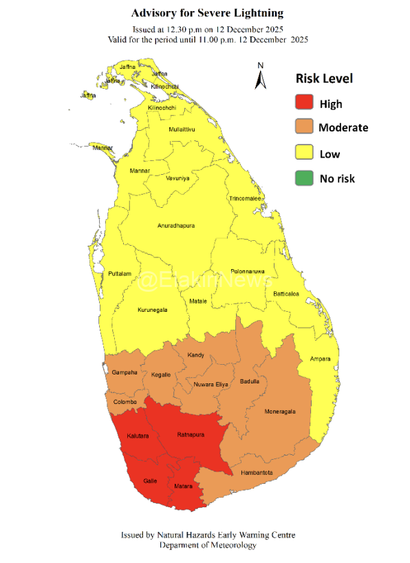 කළුතර, රත්නපුර, ගාල්ල සහ මාතර දිස්ත්රික්ක සඳහා ප්රබල අකුණු පිළිබඳ අවවාදාත්මක නිවේදනයක් නිකුත් කර තිබේ.