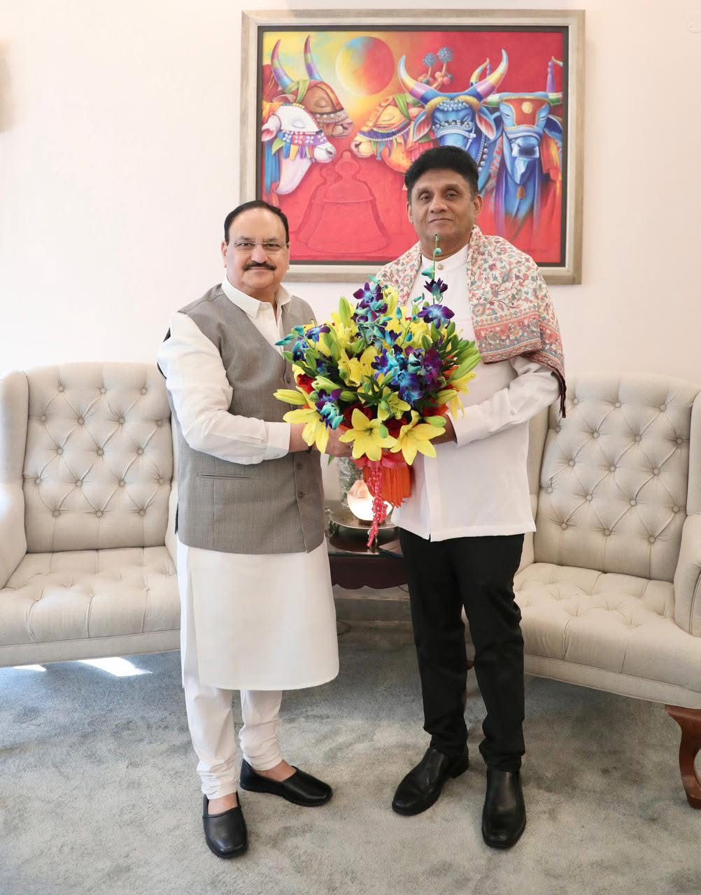 මහජන සෞඛ්‍යය වැඩි දියුණු කිරීම, ඖෂධ සහයෝගීතාව පුළුල් කිරීම සහ හිඟයකින් තොරව සැමට අත්‍යවශ්‍ය ඖෂධ ලබාගැනීම සහතික කිරීම සඳහා ඒකාබද්ධව කටයුතු කිරීමේ අවශ්‍යතාව සහ ඒ සඳහා ගතයුතු ක්‍රියාමාර්ග පිළිබඳව විපක්ෂ නායක සජිත් ප්‍රේමදාස මහතා සහ ඉන්දීය සෞඛ්‍ය හා පවුල් සුභසාධන අමාත්‍ය ජගත් ප්‍රකාශ් නඩ්ඩා මහතා අතර මෙහිදී දීර්ඝ ලෙස අදහස් හුවමාරු වුනා.